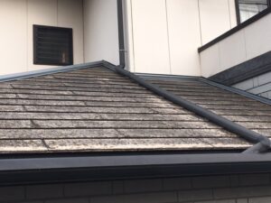 - 屋根の一部だけ黒く見える・コケがもさもさしている